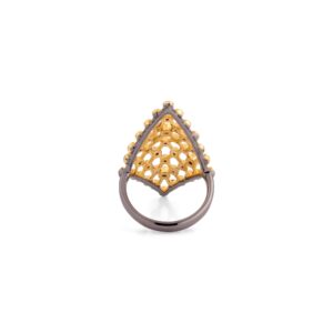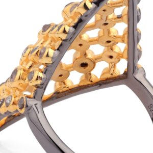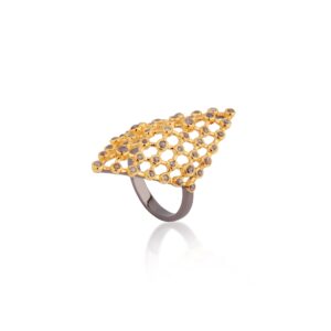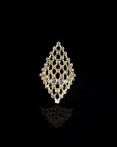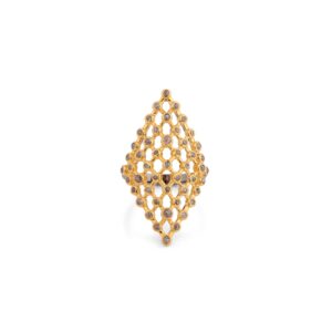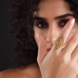Discover the captivating beauty of our Jali Pattern Ring, where geometric and organic shapes intertwine to create a stunning piece of art. This ring showcases the intricate craftsmanship and elegance of Jali, also known as lattice work. The ring boasts a gold band that effortlessly wraps around your finger, providing a comfortable fit. The highlight of this magnificent piece is the Jali pattern on the top, meticulously designed to perfection. The mesmerizing pattern adds a touch of sophistication and uniqueness to the ring, setting it apart from traditional designs . To make this ring even more extraordinary, it is adorned with sparkling diamonds that accentuate the beauty of the Jali pattern. These diamonds add a touch of brilliance and glamour to the overall appearance of the ring.