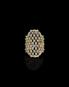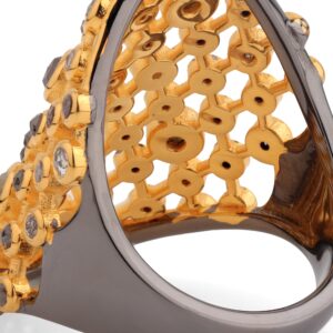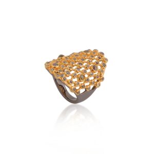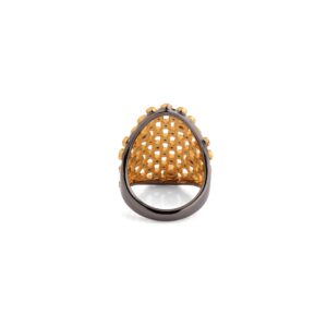 This timeless ring is nothing short of wearable art, meticulously crafted to perfection. The raw diamonds, celebrated for their natural beauty, take center stage in this captivating design. With their unique colors and characteristics, each diamond adds a touch of individuality and magic to this remarkable piece. The unique combination of sterling silver, yellow gold plating, and black rhodium plating used in the creation of this stunning ring, offers a rich and timeless finish. The use of this combination perfectly highlights the raw beauty of the diamonds, leaving you transfixed and captivated by the splendor of this stunning piece.Wear a timeless symbol of sophistication and elegance with our stunning Jali work and raw diamond ring. Indulge yourself in the beauty and allure of traditional artistry and celebrate the splendor of radiant raw diamonds embodied in this captivating piece.