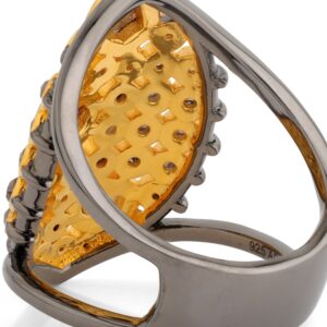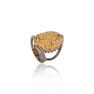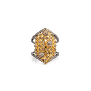 Indulge in the beauty of timeless creations with this captivating diamond ring. A favorite among women who appreciate the essence of everlasting elegance, it tells a tale of metal and diamond shimmer that leaves a lasting impression. Experience enchantment like never before with this mesmerizing piece of art. The intricate design of this ring showcases the exceptional craftsmanship behind its creation. Every curve and pattern has been carefully crafted to perfection, capturing the eye with its stunning beauty. Adorned with a mesmerizing array of colorful brown rosecut diamonds, this ring brings a touch of vibrant beauty to any occasion.