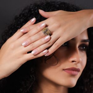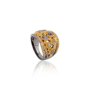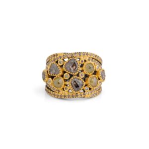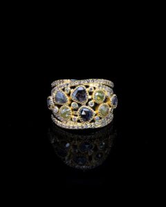 Adorned with a combination of fantasy-cut, Brown rose-cut, and Multi-color opaque rose-cut diamonds, this ring is a true masterpiece. Each diamond has been meticulously chosen to enhance the captivating allure of this exquisite piece. The unique cuts and colors of the diamonds create a mesmerizing tapestry reminiscent of nature’s wonders.With its intricate design and impeccable craftsmanship, this ring serves as a reminder to cherish the beauty of nature and foster a stronger connection with society. Embrace the artistry and elegance of this ring, as it effortlessly transforms your look into a true celebration of life’s wonders. Elevate your everyday ensemble into a vibrant celebration of nature with this extraordinary ring. Designed to nurture both nature and society, it embodies the essence of intimacy and timeless beauty.