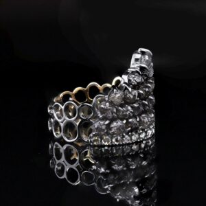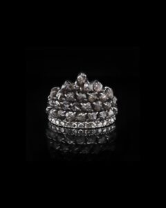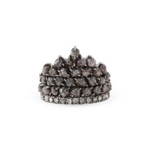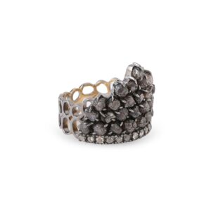 Our Regal Crown Ring is a testament to the power, grace, and elegance that every woman possesses. It is a symbol of dignity and individuality, crafted to illuminate the unique soul within.Just like a queen who makes her own rules and reigns with authority, this ring is designed to sit proudly on your finger, resembling a delicate crown. It exudes regality with a line of round rose cut diamonds that tower with the natural beauty of rough diamonds. These uncut and unpolished diamonds symbolize the raw strength and grace that lies within you.Wearing this ring, you embrace your status as a queen, a ruler of your own destiny. Let it be a reminder of your power, allowing you to embrace your uniqueness and embrace a lifelong reign.