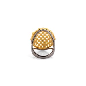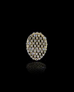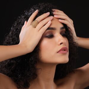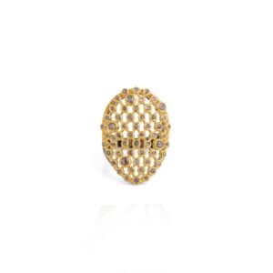 Discover our truly unique ring, crafted in intricate and mesmerizing Jali work and adorned with stunning raw diamonds. This one-of-a-kind piece is a majestic celebration of traditional artistry and timeless elegance. The Jali work, an ancient technique used in Indian jewelry, creates a stunning mesh-like pattern that is both mesmerizing and elegant. Every piece of the Jali work is crafted to perfection, showcasing the artisan’s unique skill and expertise.The diamonds used in this exquisite ring are carefully handpicked and chosen for their raw, natural beauty. Each diamond is expertly placed within the intricate Jali work, adding an enchanting display of light and shadow to the ring’s alluring design.